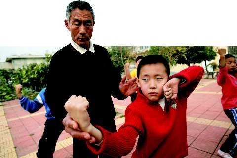 2日,在潍坊市福寿街安顺路附近,李玉亭老人正在教学生练拳。据老人介绍,目前跟他学习的学生有20多人,因为现在学生学习压力大,锻炼的机会少,平时练拳对于身体健康非常有好处,因而很多学生都跟他练拳。