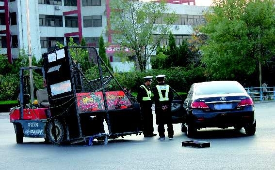 2日16时左右,在府前街与胶州路路口,—辆叉车因车上装载的篮球架挡住了司机视线,与—辆凯美瑞轿车相撞,后者尾部受到轻微损坏o图为交警在勘查事故现场o