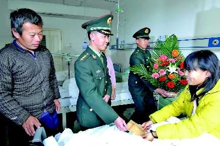 11月2日,在济南军区总医院,得知来自济阳的女孩周月身患尿毒症且 家庭贫困,济南军区总医院勤务连的战士为其捐款近1万元送到病床前。据了解,济南军区总医院勤务连的战士经常帮助有需要的病人,有的战士还私下资助失学女童。 本报记者 王倩 王媛 摄影报道