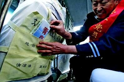 2日,在南京路上的青岛市出租汽车股份有限公司,53岁的出租车司机张志邠正往车坐椅上安装便民服务袋。当日,青岛市出租汽车股份有限公司为党员驾驶员授予了党员车标志牌,并配发了装有纸笔、一次性塑料袋、防尘布、清凉油和地图的便民服务袋。