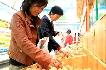 1日,在沂蒙路中段—超市内,市民正在选购鸡蛋。据销售人员介绍,鸡蛋价格近期又有所上浮,每公斤的价格比—周前上涨了约0.40元。