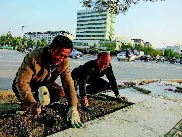 11月2日,德城区湖滨北大道天衢工业园路段人行道“换脸”,工人们将原来的花砖改铺为花岗岩路面。