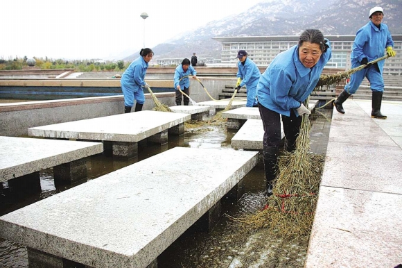 2日,几名保洁人员正在泰山广场清洗喷泉附近的节水池。为保证市民欣赏到干净整洁的广场,工人们将对池中堆积较厚的青苔进行一次大规模的清理。