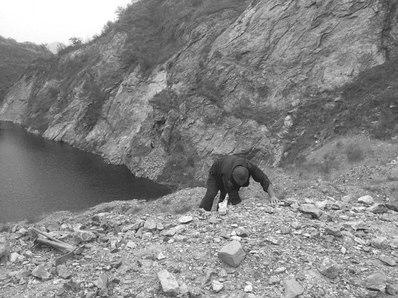 翻到山的东侧,视野豁然开朗起来。几座小山间包围着面积有四五个足球场大小的积水潭,潭水清澈见底。“这潭水是采矿挖出的大坑积水而成,听说潭底有不少玉石。”司机史先生说。在水潭的东侧,碎石块都堆积在山体上。餐馆老板刘先生正蹲在碎石堆上寻找玉石。他说:“今天运气一般,没发现成色很好的,才找到几十斤质量一般的石头。”他旁边的梁先生用小锤轻轻敲下石头边上的一块,随即双手拿工具用力一撬,一块发黑的大石头就被他从石堆里撬了出来。他小心翼翼地把皮带套在石头上,把石头吃力地拉到平地上。梁先生说,他从今年4月就来找矿石,到现在已经找了二三十次了。“夏天找到一块好玉,卖了1万块,今天的这块有三四十斤,也能卖个好价钱。”梁先生说。