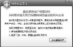 本报讯 11月3日晚间,在360正式下线“扣扣保镖”产品后,其对外发布“360致网民的紧急求助信”,称目前是360生死存亡的紧急关头,希望用户“为了互联网安全的未来,停用腾讯QQ三天”,以示对腾讯公司不尊重用户权益的抗议。