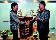 11月3日,济南兴隆物业有限公司负责人张警生(右一)将表达谢意的锦旗送到了本报记者手中。近日,张警生通过拨打本报联合济南市城管局推出的“百姓城管热线”(96706111),使得小区里的化粪池得到了及时清疏,解决了小区里的一大难题。 本报记者徐延春 摄