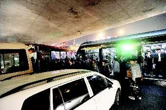 11月3日晚6点多,生产路北园高架桥下,往来车辆堵成—片,东西、南北方向的车辆分别堵了五六百米。大约过了20分钟,公交车上的乘客纷纷埋怨着下了车,选择步行离开。据了解,是由于下班高峰期车辆太多互不相让造成的。本报记者 王媛 摄