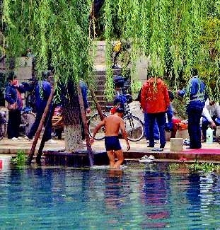 2日,记者在东护城河新建船闸南侧看到,六七位市民正身着泳裤在护城河里一前一后,你追我赶,游得不亦乐乎。