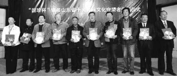 “国珍杯”首届山东“十大民间文化守望者”评选活动由省政协科教文卫体委员会、山东省民俗学会、山东省企业信用与社会责任协会、齐鲁晚报等单位共同主办,评选活动于今年3月19日启动,全省各地的民俗传承人、民俗文物收藏家、民间艺术家及众多民间组织积极参与,组委会收到了62位参评者的个人申报资料,山东省民俗学会组织部分专家,针对申请报名情况对申报人和申报单位进行了实地考察,并进行现场评估,之后进行了网上评选和专家评审。8月29日,主办方邀请中国民俗学会理事长刘魁立担任评委会主任,组织北京、香港及省内的十余位专家展开评选,最终确定马春霞、田传江、巩日祜、何晓铮、范正安、姚忠贤、逄焕健、姜殿平、樊存常、褚祺为山东“十大民间文化守望者”。王善民、姜忠沺、鲁汉、王大海、李百钧、刘学斌、刘奎、王巍岩、李天丰、杨遵利、柏良等获提名奖。