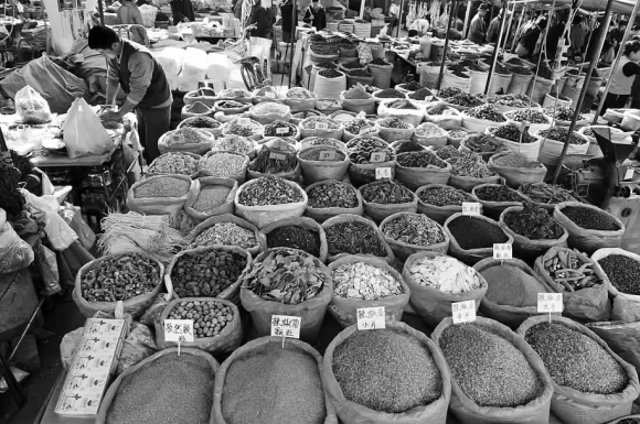 3日,在李村大集上,出售调味料的商人李荣山正在收拾调料。据了解,近期花椒、大香、姜片等调味料每斤进价上涨近10元。李师傅告诉记者,受灾害天气影响,主要的调料食材产区产量降低,很多调料供货不足。