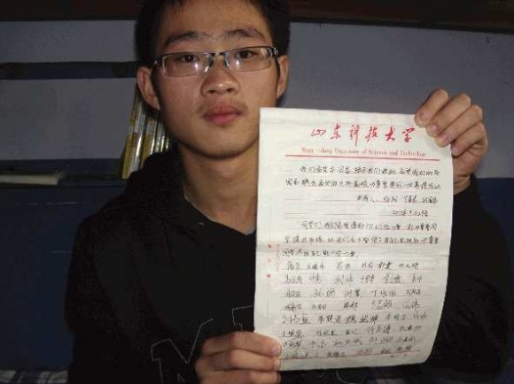 为帮助董雪,董雪的几名高中同学积极寻找各种渠道为她募捐,目前已通过爱心倡议发动了200多名学生联合签名为董雪寻求募捐。图为董雪的同学刘国伟展示签名名单。 本报记者 李虎 摄