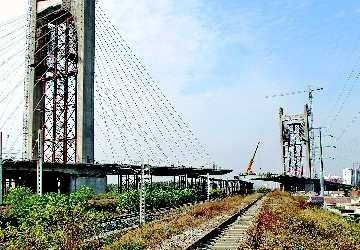 11月3日1记者从太白楼路沈府河大桥看到1大桥施工进入跨铁路阶段1仅剩30余米便可合龙。据工程负责人介绍1跨铁路部分在火车通过时停止施工1每天仅有两小时作业时间。