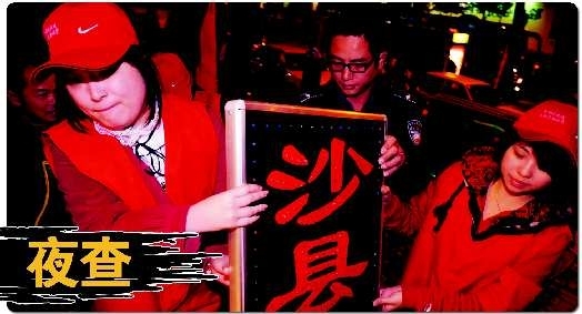 11月3日晚,三名女孩参加“百姓城管”体验执法行动,帮助占路摊点收拾东西。