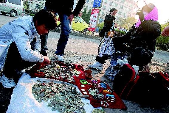 摊主是一名中年妇女,她的面前摆着一堆古代钱币、玉器等“古董”。她自称是从偏远山村收来的。其中最便宜的一种是“康熙通宝”,售价3元一枚。当好奇的市民围观上来时,摊主还会从她的包里拿出“一些年代更远的钱币”。