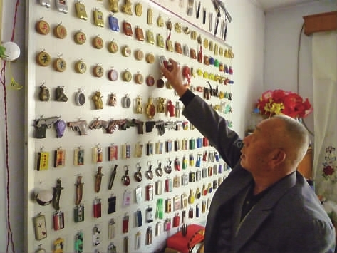 亲戚朋友都知道他这个爱好,便帮他四处搜集新奇的烟盒,街坊邻居了解他的收藏经历后也顺便帮他到处寻找少见的烟盒。这几年,马尚福又喜欢上了收藏打火机。记者在马尚福家里看到,客厅的墙壁上整齐地挂满了400多个各式各样的打火机,其中有中国象棋式的,有各种长短枪式的,炒锅、压力锅、乒乓球拍,手雷、火箭、车钥匙,形态各异的打火机让人叹为观止。