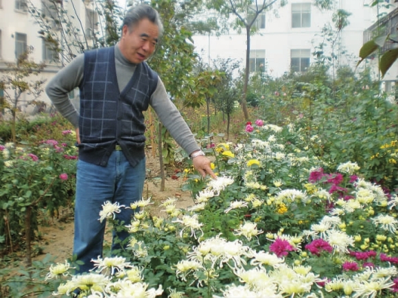 丛中间查看自己养的花,像爱抚自己的孩子。“其实养花关键在于养护,这是个慢工夫。”房老师介绍说,这些花很多都是自费买来的,淡绿色品种的菊花更是费了很大工夫才买到。“‘卫生靠大家’,谁不希望有个好环境,年轻人没时间,我们退休的多干点。”说到自己的行为,房老师一直觉得自己闲得厉害,所以应该为大伙儿干点事。
