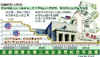 美联储解释说,经济复苏缓慢,失业率高企,通货膨胀水平距离安全线尚有一定距离等原因,促使美联储出台定量宽松政策。与市场预期吻合,美联储决策机构联邦公开市场委员会3日公布新一轮定量宽松政策,同时把基准利率维持在零至0.25%的区间不变,即继续施行零利率政策。