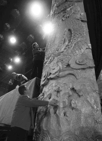4日下午,记者来到“2010泰山论坛”开幕式会场———泰山影剧院,工作人员正在为舞台铺设地毯。记者看到,开幕式场地的布置工作已基本就绪,影剧院的所有座椅均已换上红色的新座套,会场过道也铺设了大红色的地毯,舞台上屹立着4根8米高的金黄色的龙柱。