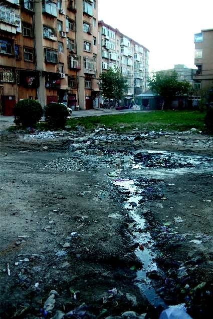 如图:污水成“河”,流进了小区绿地。 本报记者钟建军 摄