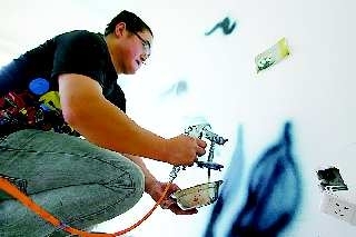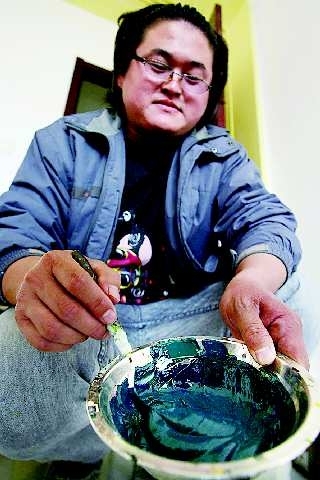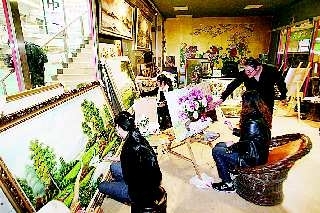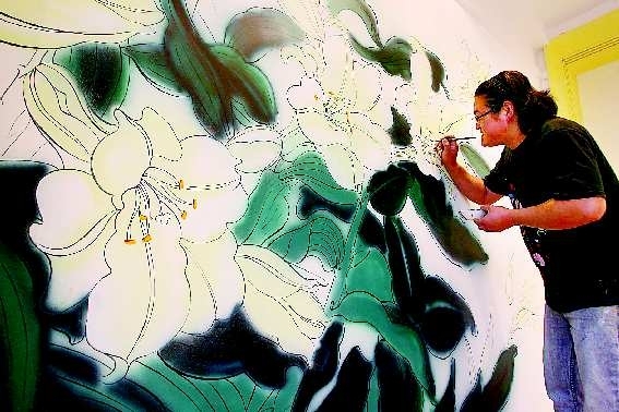 近日,记者在烟台市区一家正在装修的酒店看到这样一帮绘画者,他们用喷枪在墙上尽情喷洒,而后用画笔在喷过的地方仔细勾画,清新脱俗的百合、雍容华贵的牡丹等一幅幅唯美而又立体的画面慢慢在墙上展现出来。
