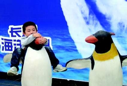 时间:10月16日;地点:苏州;自述:调皮的小朋友爬到了企鹅的雕塑上,两腿一伸像企鹅的手。点评:企鹅变“骑”鹅,