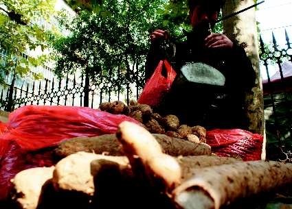 11月4日,在市区西苑小区,—商贩正在兜售新鲜上市的芋头、山药o据介绍,目前正是芋头、山药大量上市的季节,具有进补功效的山药、芋头,深受老人和孩子的喜爱o