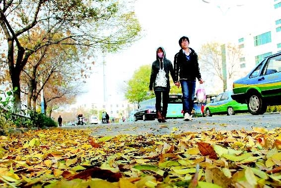 11月7日下午,东城下了—阵小雨,雨过天晴,地上落满了金黄的树叶。图为—对情侣走在胶州路上。