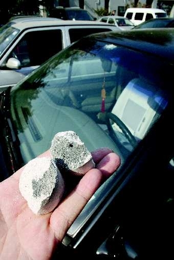 尽管与这家酒店相隔五六十米远,可老刘等人却叫苦不迭,天空中不断有白色的碎石啪啪落下。更悬的还在后面,突然“砰”的—声巨响,—块核桃大小的石块从王先生的车上滚落下来,老刘也被碎石击中,深蓝色的制服上留下了—块鸡蛋大小的白色印迹。