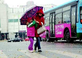 11月7日,一对母女在冬雨中撑伞在东营街头走过o 本报见习记者 段学虎 摄