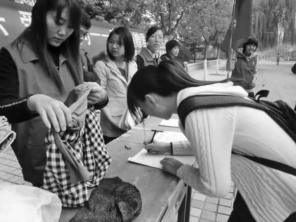 6日上午,一块“为善最乐、爱暖心间”的大型展板摆放在山大分校生活服务区内,展板上分别以图片和文字的形式介绍了贫困山区的一些孩子没有足够的衣物过冬,一场爱心衣物公益募捐活动正在举行。记者在现场看到,许多大学生提着大包、小包前来捐献衣物,其间还有周围一些居民带着衣物前来捐献,有的小朋友闻讯后还主动捐出了自己的学习用品及玩具等。