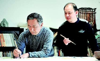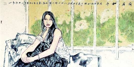 两位画家在生活中是相熟的朋友,不过却从未进行笔墨对话。此次李兆虬画主题人物———一现代女性,时尚而古典;杨文森画屏风,上面绘亭亭绿荷,婉约如诗。主题人物与屏风背景相呼应,在色与墨的渲染中达到和谐,堪称一幅成功的国画作品。优雅的荷屏,映照出画家的平和心态,《荷屏·和平》,乐在唱和,妙在构思,美在意境。