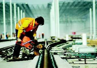 在东站站房南侧,七八名工人正手持切轨机对铁轨进行切割,机器的轰鸣声震耳欲聋。“现在做的是对道岔和正线进行焊接,将他们连接起来。”中铁一局十二工区工程部长王万平告诉记者,京沪高铁对焊轨技术要求非常高,焊接工作只能在20℃到26℃之间的温度下进行,“白天不能干,晚上也不能干,只有中午的温度合适。”王部长表示,等焊接完成后还要进行打磨,打磨对轨道平直度以及水平高低都有严格要求,打磨后还将由类似“X光机”的精密仪器对焊接处进行“核伤”,“有气泡就不合格。”