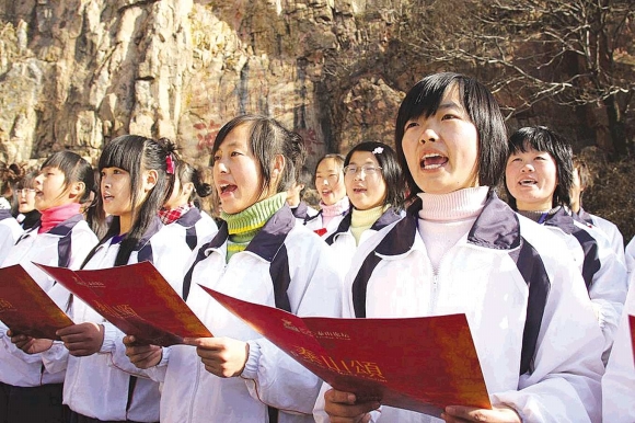 11月7日上午,2010泰山论坛《泰山宣言》发布后,泰山学院的学生在大观峰朗诵《泰山颂》。本报记者 陈琳摄