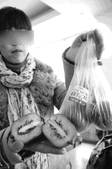 记者捏了一下,这些猕猴桃非常坚硬。其中有一个猕猴桃已经切开,果肉呈黄白色,闻起来有一股土腥味儿。记者尝了一下,味道又酸又涩根本不能吃。苏女士说:“自从把猕猴桃买回家来,我几乎一星期捏一次,可是它就是不变软,我非常怀疑这猕猴桃有问题。”