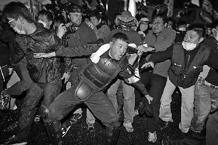 —名防暴警察被示威者拽住。
