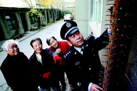 8日,在潍坊市松园子社区,城关派出所的民警正在为居民安装防盗装置o为了避免入室盗窃案件的发生,城关派出所的民警为辖区内的居民楼安装防盗刺o为防止小偷顺着管道攀爬入室,防盗刺安装在居民楼的雨水管道和窗台上o