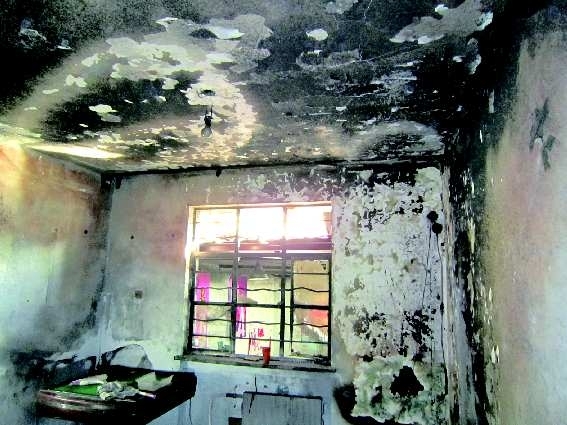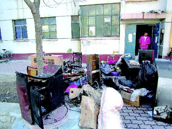 8日上午11时许,府前小区—居民楼内,由于线路老化引起火灾,火很快被扑灭。饮水机被烧得只剩空壳,电脑显示器的外壳已融化,储物柜内的东西均已化为灰烬。图为被火烧过的物品。(小图为被火熏得黢黑的墙壁)