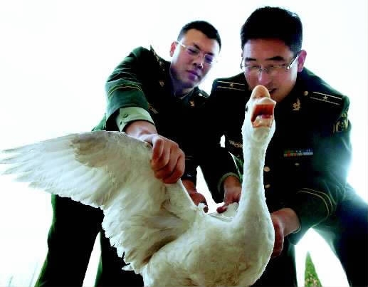 8日下午,烟台莱山区马山寨边防派出所指导员林富国将一只受伤的“天鹅”送到南山公园,公园的工作人员马瑢