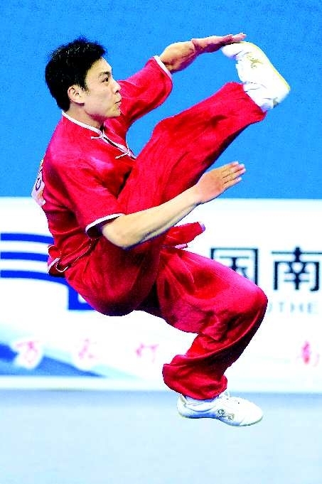 上图:11月13日,中国武术运动员袁晓超在武术男子长拳比赛中以9.78分成功卫冕。这