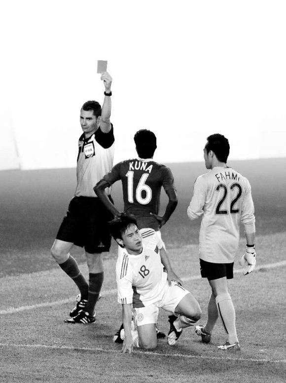 开场之后,中国队便占据一定的主动。战至第25分钟左右时,马来西亚很难得地攻至前场获得了一次角球机会,没想到这却给他们带来了灭顶之灾———在1分钟的时间之内,马来西亚队球员贾苏利、队长拉希姆因为对裁判表示质疑,接连被澳大利亚籍主裁威廉斯罚出场外。尽管早早地拥有了人数上的优势,中国国奥队在上半场却未能破门。