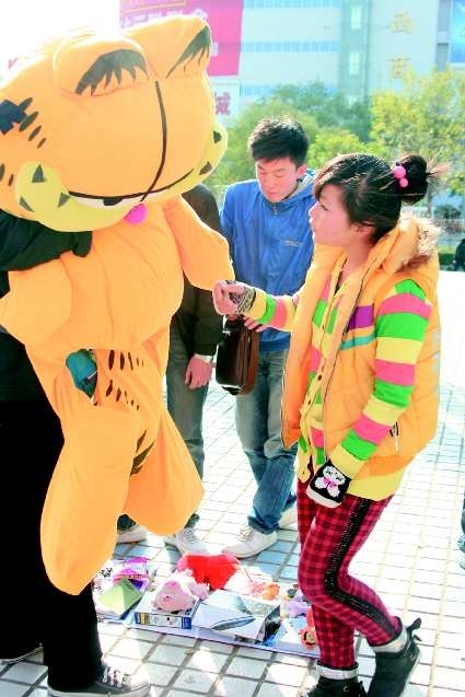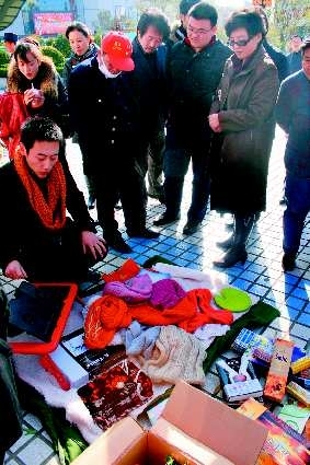 “快来看啦,漂亮的围巾。”上午10点,换物现场一名20岁左右的男生摆好摊儿吆喝了起来。他先在地上铺了一层棉布,又铺了一层毛毯,毛毯上摆了十几条漂亮的围巾,一开摊儿就引来很多人围观。(如右图)