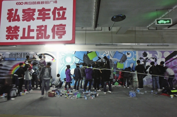 14日,在青岛颐高数码广场的地下停车场,青岛大学美术学院的160余名学生正在为墙壁彩绘。据介绍,为了突出停车场的个性,停车场所属单位出资,请青岛大学的同学们为墙体做彩绘,这次他们一共彩绘了12面墙,每面墙高2.5米,宽6米,历时8个小时完成。本报记者 杨宁 摄