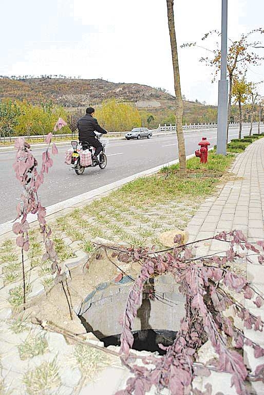 记者在事故现场看到,当时李兴芳跌落的检查井中,有许多大石块,还有一些直径10厘米左右的PVC管道。在大桥两侧,记者还发现了3处情况相同的检查井,深度从半米到2米不等。张师傅告诉记者,这些检查井原本都有铸铁井盖,大约3天前全都丢失了,连安装井盖的铸铁底座也不见了踪迹。为了提醒路人,他们只好在裸露着水泥槽的井口附近插上了一些树枝。