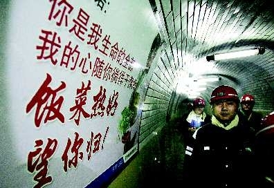 13日上午,在梁宝寺煤矿,煤矿工人们穿过矿井下的“文化长廊”进入工作区。记者发现,矿区专门在工人工作区墙壁的宣传栏上写了“温馨寄语”,并播放温馨音乐,让前来工作的矿工如同回到家中一样温暖。