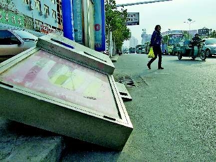 11月14日,德州长途汽车站对过,两天前被大风刮倒的垃圾桶仍躺在地上,不见有人修理。本报记者苏超 摄