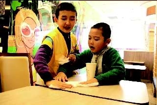 13日,9岁的唐家琦就围着于店长找活干,还主动请缨帮忙打扫卫生间的卫生。14日上午,12岁的马鹏程和黄庆鸿跟在于店长的身后问道,“叔叔,我们干点什么啊?”随后黄庆鸿和马鹏程两人一组,一起排桌子,黄庆鸿一会跑这边一会跑那边,两人一会就把桌子排齐了。