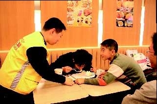 13日一早,乐天利快餐店迎来了郭家的送行大军一一一明远的妈妈、姥姥和姥爷。明远是个很机灵也很调皮的小男孩,长得虎头虎脑,非常可爱。一开始培训时,小家伙不听话,和7岁的王川旭在餐厅里跑来跑去。