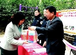 济南市城管局副局长胥嘉印(右—)向无影潭社区负责人赠送了城管法律法规图书o 本报记者 王媛 摄