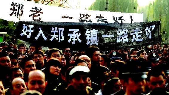 在殡仪馆的小广场上,近千名市民自动排好了队。天桥保安公司的20名保安排着整整齐齐的队伍,打着“好人郑承镇一路走好”、“沉痛哀悼郑承镇老人”的横幅,站在送行队伍中,脸色凝重。