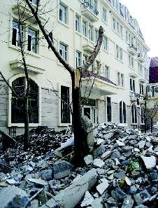 当日上午,在位于天桥区明湖西路的一座办公楼里,记者看到,大楼前面横七竖八地堆放着废弃的石灰板、废铁皮等建筑垃圾。一个工人模样的人正在大楼四楼向楼下丢一些建筑垃圾。由于从高处抛撒垃圾的缘故,大楼前面的几棵大树已经是伤痕累累,一些枝干都被垃圾给砸断了。距大楼十多米处就是居民楼,居民王先生说,该大楼装修施工已有半个月之久,而这个过程中,每天都有大量的建筑垃圾被直接从4楼或5楼的窗口抛下来。“哪有这样做的?把建筑垃圾直接扔下来,他们倒是省事,但把我们这儿弄得尘土飞扬的,我们都不敢开窗透气了。”王先生很气愤地说。居民郭女士也说,施工队有时在中午或晚上也施工,高空抛下的垃圾撞击地面产生很大的噪音,让自己的小孙子都睡不好。